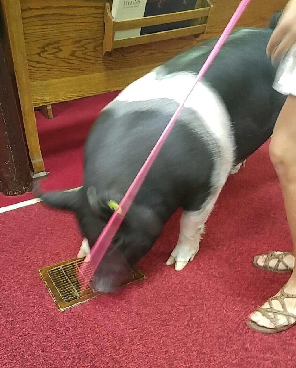 The service started as normal, and then when it was time for children’s moment, I told the congregation not to be scared, that our special guest would not bother them, at least I didn’t think so! We talked about the ribbons, and the fact that they are a rating system, and that an animal is not judged on their presentation at that very moment, but as a project as a whole. We talked about the amount of work that goes into a project animal, and the accountability that goes along with a 4-H project. The record keeping, the meetings, the interview, the preparation of the animal… it’s not just showing up and being in the ring for thirty minutes one day. It’s a long process. We talked about how when a person goes in the ring, they always face the judge, it’s a mark of showmanship. They never take their eyes off of him as they maneuver their animal around the ring. Our God is like that. He is our judge, He is the one who commands the ring, and our attention, and if we keep our faces turned toward Him, our eyes on Him, we will always know what to do. We will know what He is calling us to do. We will be in relationship with Him. When Felicia the pig came into the church, it was quite a deal. Our church isn’t really a place that a pig has ever been before, and I know it may have been uncomfortable for some people, but you know what? Jesus preached around pigs, why shouldn’t I??? (this thought just helps me get over anything negative anyone might say)