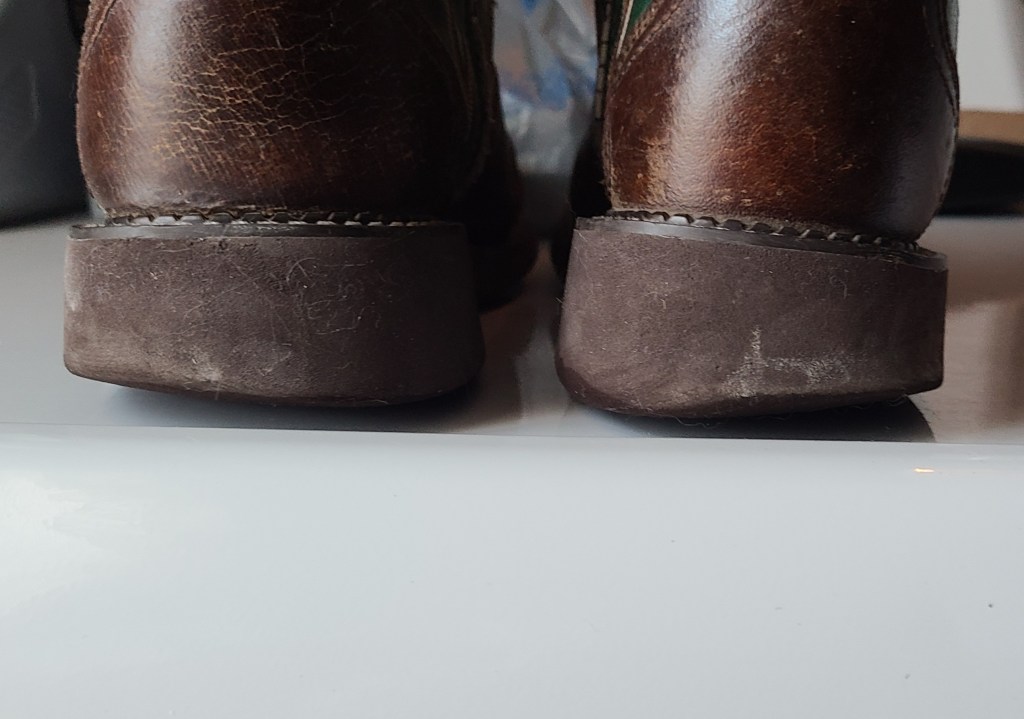 You can clearly see that the heel of the right boot is more rounded. It has a very different wear pattern than the left. When a person comes in with multiple symptoms that do not seem to fit a single disease (or symptoms fit a disease that may not be TYPICAL for their age or sex), please, please look at their feet, and do not be afraid to refer to a specialist!